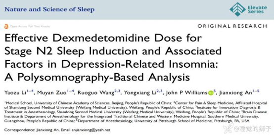 病人自控睡眠是恢复睡眠节律紊乱,进而修复损伤脑细胞的关键环节,而当下唯一能诱导出自然睡眠的右美托咪定(简称右美)是整个治疗过程中关键因素,那么居家病人睡眠调控右美的合适剂量如何确定呢?通常伴随年龄增长,治疗所需药物会减少,但安建雄团队研究发现,抑郁伴失眠患者对右美的需求却与年龄呈正相关。这一重要发现近日在国际英文期刊“Nature and Science of Sleep”(睡眠的自然和科学)刊发。第一作者为中国科学院大学医学院在读博士研究生、山东第二医科大学麻醉创新研究院研究学者李耀祖,其导师安建雄教授为通讯作者。